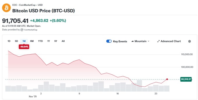 [서울=뉴스핌] 고인원 기자= 미국 추수감사절 연휴를 앞두고 최근 급락세를 면치 못했던 가상화폐 대장주 비트코인이 약 일주일 만에 극적인 반등에 성공하며 9만 달러 선을 회복했다. 이는 통상적으로 연휴를 앞두고 거래량이 줄며 약세를 보였던 과거 추세와는 상반된 이례적인 움직임으로, 연말 미국 연방준비제도(Fed·연준)의 금리 인하에 대한 시장의 기대감이 위험자산 투자 심리를 되살린 것으로 풀이된다.