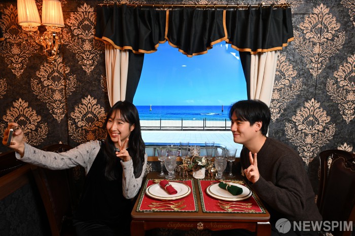 [서울=뉴스핌] 양윤모 기자 = 늦가을의 추억이 무르익는 27일 서울 노원구 공릉동 화랑대철도공원 내 오픈 준비중인 유럽풍 특급열차 레스토랑 ‘익스프레스 노원 by 미라쥬’에서 평가단이 개장 전 인증샷을 촬영하고 있다. ‘익스프레스 노원 by 미라쥬’ 1량은 영화 세트 전문가가 특수 제작하고 1량은 무궁화호 객차를 리모델링해 주방 및 운영 공간으로 구성했다. 내부는 정교한 문양과 샹들리에, 유럽풍 소품으로 꾸며져 특급열차의 화려한 감성을 그대로 담아냈다. 레스토랑에서는 ‘태릉솔밭 갈비 파스타’, ‘불암산 리조또’ 등 노원만의 특색을 담은 메뉴를 선보일 예정이며, 지역 상권 활성화와 지역 명소화를 위해 로컬 브랜드 사업자와의 협업을 통해 운영한다. 레스토랑은 12월 2일부터 정식 운영되며, 매주 월요일을 제외한 화요일부터 일요일까지 오전 11시부터 오후 9시까지 운영된다. 설·추석 명절 당일 휴무 외에는 공휴일에도 정상 운영될 예정이다. [사진=노원구청] 2025.11.27 yym58@newspim.com
