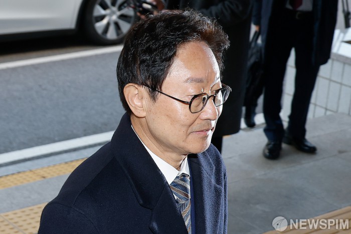 [서울=뉴스핌] 류기찬 기자 = 박범계 더불어민주당 의원이 28일 오전 서울 양천구 서울남부지법에서 열린 패스트트랙 충돌 사건 관련 1심 결심공판에 출석하고 있다. 2025.11.28 ryuchan0925@newspim.com