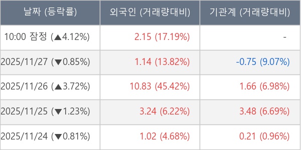 [서울=뉴스핌] 로보뉴스 = 28일 10시 15분 현재 아주IB투자(027360)는 전일 대비 4.12% (현재가 2,070원) 상승했고, 외국인이 최근 5일 연속 순매수(누적 18.37만 주, 잠정) 행진을 하고 있다.