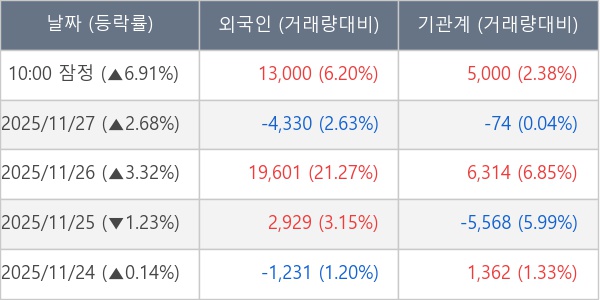 [장중수급포착] 레인보우로보틱스, 외국인/기관 동시 순매수… 주가 +6.91%