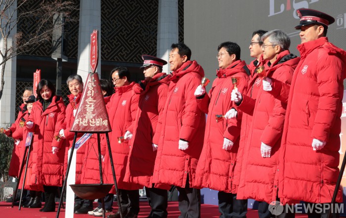 [서울=뉴스핌] 이길동 기자 = 김병윤 한국 구세군 사령관과 오세훈 서울시장, 전성환 대통령실 경청통합수석비서관등 시종식 참석자들이 28일 서울 종로구 광화문광장에서 열린 '2025 구세군 자선냄비 시종식'에서 타종 세리머니를 하고 있다. 올해 자선냄비 캠페인 주제는 'Light of Hope-희망의 빛'으로, 시민 한 사람 한 사람이 '희망의 메신저'로 참여해 우리 사회의 어두움을 함께 밝히자는 메시지를 전한다는 의미다. 자선냄비에는 NFC 기반 기부 시스템이 처음 도입돼 현금이 없어도 스마트폰을 모금판에 한 번 태그하는 것만으로 앱 설치 없이 누구나 기부할 수 있다. 2025.11.28gdlee@newspim.com