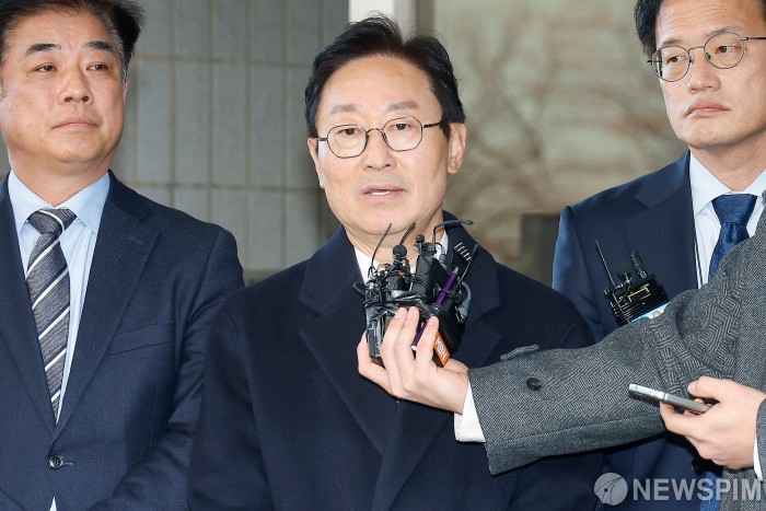[서울=뉴스핌] 류기찬 기자 = 박범계 더불어민주당 의원이 28일 오후 서울 양천구 서울남부지법에서 열린 패스트트랙 충돌 사건 관련 결심공판에서 벌금 400만원을 구형받은 가운데 취재진에 입장을 밝히고 있다. 2025.11.28 ryuchan0925@newspim.com