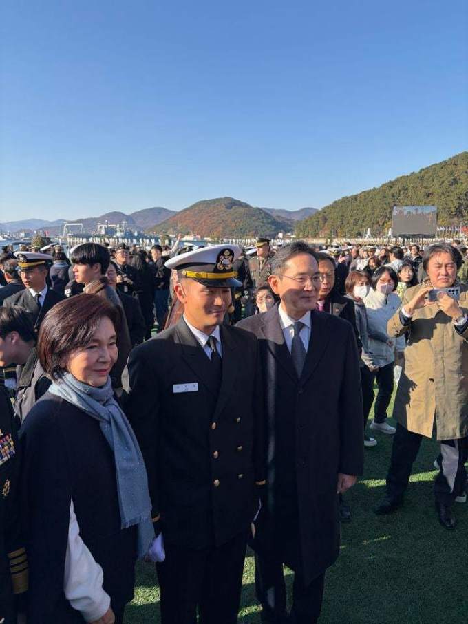 이 가운데 이재용 삼성전자 회장의 장남 지호 씨는 지난 9월 말 해군 학사사관후보생 139기로 입대해 사관학교에서 11주가량의 훈련을 마쳤다. 이날 임관식에서 기수 대표로 제병을 지휘했다. 이 회장은 오후 1시 20분쯤 홍라희 리움 명예관장, 이서현 삼성물산 사장과 함께 임관식이 열리는 해사 연병장 단상에 마련된 가족석에 모습을 드러냈다. 이 회장이 오른편에 홍 명예관장, 이 사장이 나란히 앉았다.