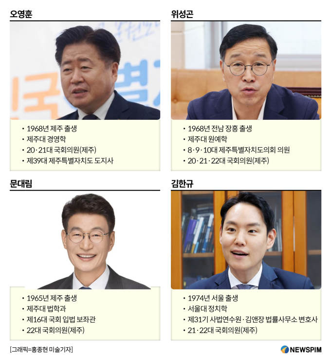 29일 정치권에 따르면 민주당 내에서 오 지사의 대항마로 거론되는 이는 위성곤(3선)·문대림(초선) 의원 등이 대표적이다. 도당위원장인 김한규 의원도 꾸준히 언급되는 후보군이다.