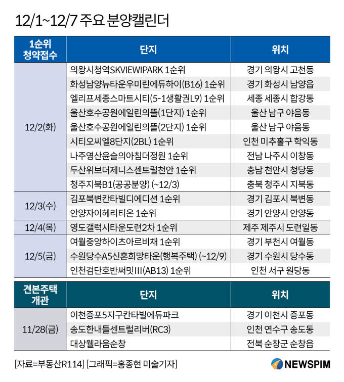 [서울=뉴스핌] 송현도 기자 = 29일 부동산R114에 따르면 12월 첫째 주에는 전국 14개 단지 총 1만 721가구(일반분양 7799가구)가 분양을 시작한다. 경기 의왕시 고천동 '의왕시청역SK뷰아이파크', 인천 미추홀구 학익동 '시티오씨엘8단지', 충남 천안시 청당동 '두산위브더제니스센트럴천안' 등에서 청약을 진행한다.