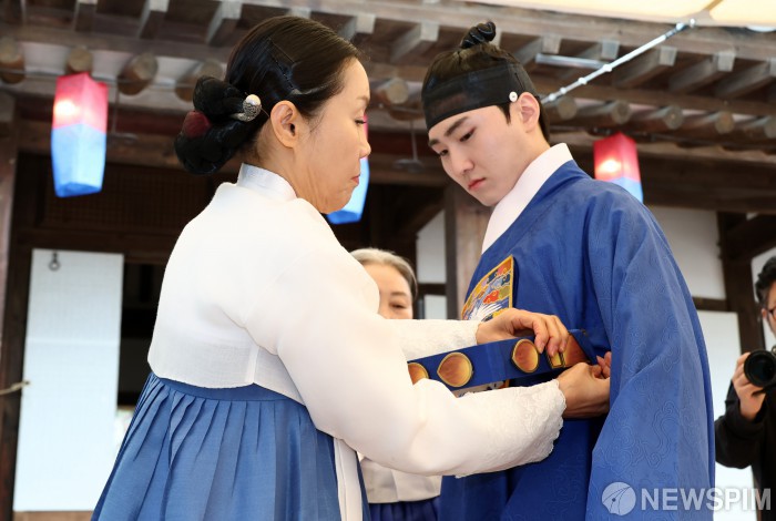 [서울=뉴스핌] 최지환 기자 = 29일 오후 서울 중구 남산골한옥마을에서 전통 관례·계례 재현 행사 '나의 스무살에게'가 진행되고 있다. 관례는 남자가 갓을 쓰고 도포를 입는 의례, 계례는 여자가 비녀를 꽂고 족두리를 쓰는 의례로 전통사회의 성인식을 의미한다. 2025.11.29 choipix16@newspim.com