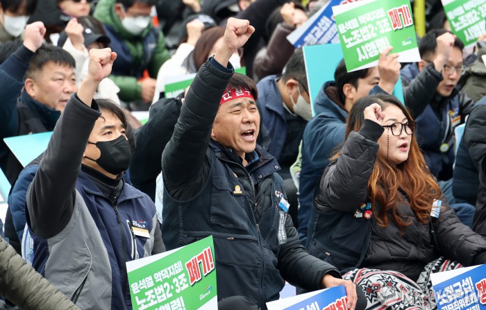 [서울=뉴스핌] 최지환 기자 = 공공운수노조 조합원들이 29일 오후 서울 용산구 대통령실 인근에서 열린 '공공운수노조 총력투쟁 결의대회'에서 구호를 외치고 있다. 2025.11.29 choipix16@newspim.com