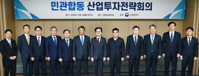 | 김정관 산업통상부 장관(왼쪽 일곱번째)과 국내 10대 기업 대표들이 1일 오전 서울 중구 대한상공회의소 EC룸에서 열린 '민관합동 산업투자전략회의'에서 기념사진을 찍고 있다. [사진=산업통상부] 2025.12.01 dream@newspim.com |