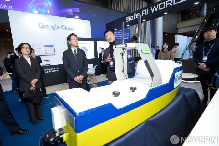[서울=뉴스핌] 배경훈 부총리 겸 과학기술정보통신부 장관이 1일 오전 서울 강남구 코엑스에서 열린 '2025 인공지능(AI) 해킹방어대회' 에 참석해 전시부스에서 설명을 듣고 있다. [사진=과학기술정보통신부] 2025.12.01 photo@newspim.com