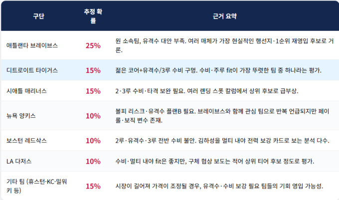 미국 칼럼과 파워랭킹에서는 보스턴, 시애틀, 휴스턴, 캔자스시티 등이 반복해서 언급된다.​ 보스턴은 2루·3루·유격수 전반의 수비와 뎁스 문제로, 김하성을 멀티 내야로 활용하는 그림이 부각된다.​ 시애틀은 J.P. 크로포드 뒤 내야 공격력·수비를 동시에 보완할 카드로 2·3루 중심 배치 시나리오가 거론된다.​