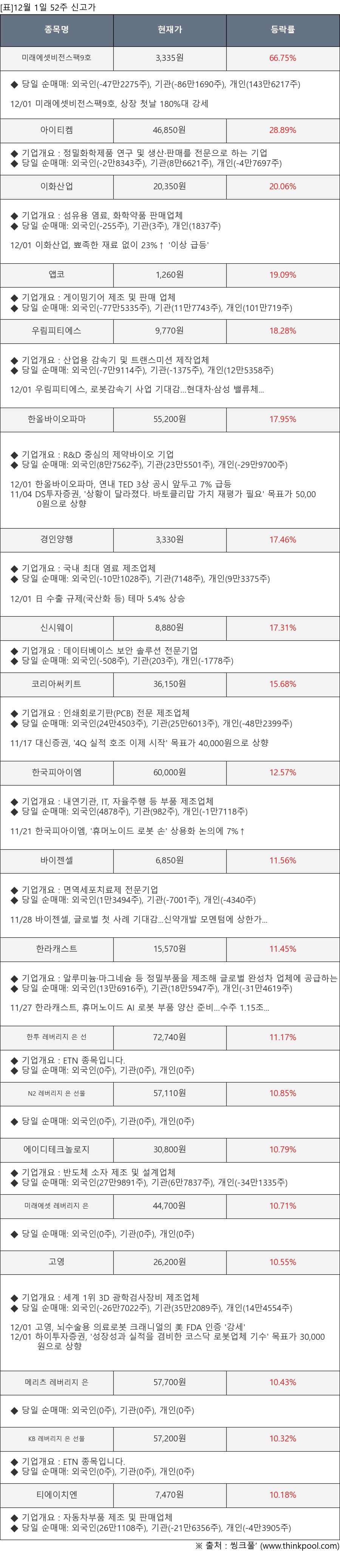 [표]12월 1일 52주 신고가 종목 및 최근 동향