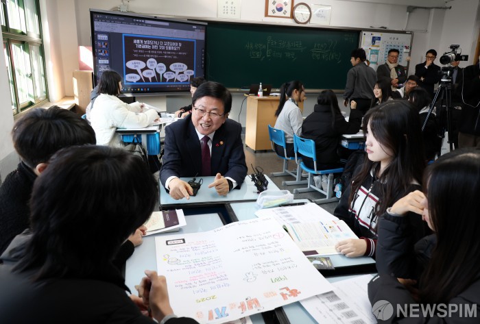 [서울=뉴스핌] 최교진 교육부 장관이 1일 오전 서울 관악구 난우중학교에서 헌법 수업 참관을 하며 학생들과 대화를 나누고 있다. [사진=교육부] 2025.12.01 photo@newspim.com