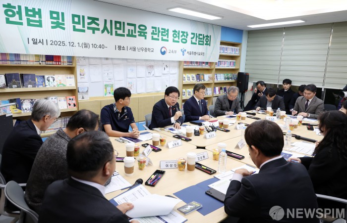[서울=뉴스핌] 최교진 교육부 장관이 1일 오전 서울 관악구 난우중학교에서 열린 헌법 및 민주시민교육 현장 간담회에서 발언을 하고 있다. [사진=교육부] 2025.12.01 photo@newspim.com