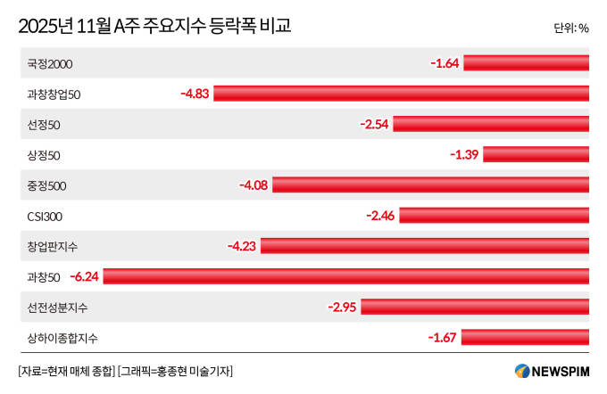 특히, 11월 AI 거품론이 일면서 기술주가 가장 큰 변동세를 연출했다. 그 결과 상하이증권거래소 산하의 기술주 전용 시장인 과창판(科創板∙커촹반)에 상장된 시가총액(시총) 규모가 크고 유동성이 우수한 50개 기술주의 대표 종목을 선별해 산출한 '과창50지수'는 6.24%, 선전증권거래소 산하의 중소형 혁신∙기술 성장주 전용 거래 시장인 창업판(創業板∙촹예반)과 과창판에 상장된 50개 우량 신흥산업 종목의 주가를 반영한 과창창업(科創創業)50지수는 4.83% 떨어졌다. 핵심 지표 중 낙폭 순으로 1위와 2위에 올랐다.