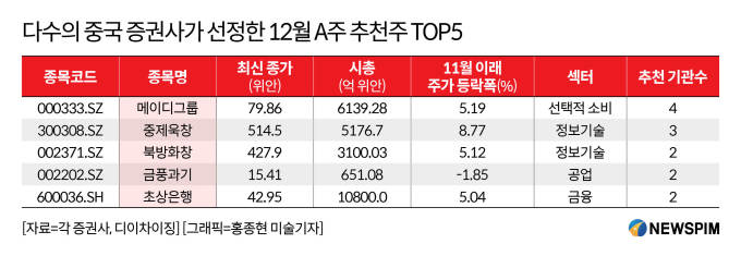 중국 유력 경제매체 디이차이징(第一財經)이 현재까지 12월 추천주를 내놓은 증권사 데이터를 기반으로 산출한 불완전한 통계에 따르면, 기관 추천수 순으로 상위 5위권을 차지한 종목은 중국 대표 가전 제조업체 메이디그룹(000333.SZ). 전세계 광모듈 업계 1위 기업인 중제욱창(300308.SZ), 중국 국산 에칭(식각) 장비 업계를 대표하는 북방화창(002371.SZ), 풍력터빈 업계 대표기업 금풍과기(002202.SZ), 주식제 은행의 선두주자 초상은행(600036.SH)으로 집계됐다.