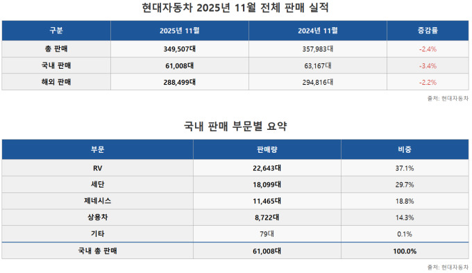 [서울=뉴스핌] 이찬우 기자 = 현대자동차가 2025년 11월 전 세계 시장에서 총 34만9507대를 판매하며 전년 동월 대비 2.4% 감소한 실적을 기록했다. 국내와 해외 판매가 각각 소폭 줄며 전체 판매도 감소세를 보였다.