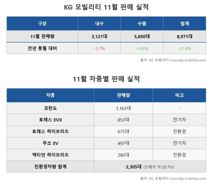 [서울=뉴스핌] 김승현 기자 = KG모빌리티(KGM)는 지난 11월 내수 3121대, 수출 5850대를 포함 총 8971대를 판매했다고 1일 밝혔다. 전년 동월 대비 1.4% 증가한 수치다.