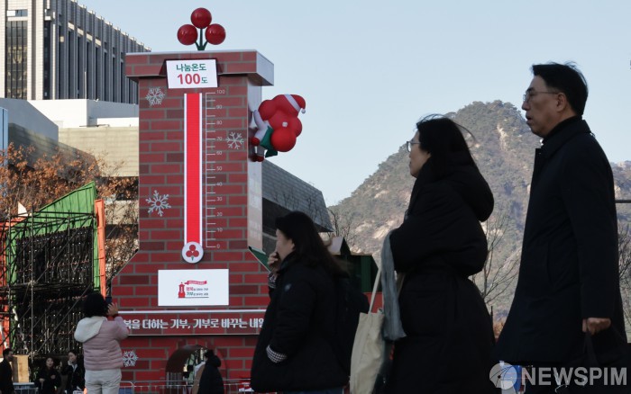 [서울=뉴스핌] 양윤모 기자 = 사회복지공동모금회가 주최하는 '희망 2026나눔캠페인'의 시작을 알리는 사랑의 열매 출범식이 1일 오후 서울 광화문광장에서 개최된 가운데,사랑의 온도탑이 가동을 시작했다. 사랑의열매 사회복지공동모금회는 “행복을 더하는 기부, 기부로 바꾸는 내일”을 슬로건으로 12월 1일부터 내년 1월 31일까지 62일간 전국 17개 시·도에서 4500억원을 모금한다. 2025.12.01 yym58@newspim.com