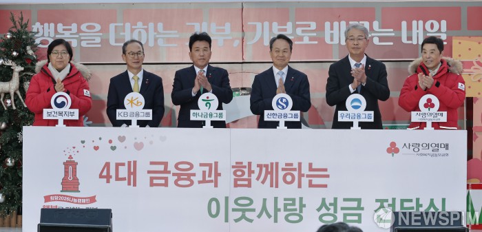 [서울=뉴스핌] 양윤모 기자 = 사회복지공동모금회가 주최하는 '희망 2026나눔캠페인'의 시작을 알리는 사랑의 열매 출범식이 1일 오후 서울 광화문광장에서 개최된 가운데, 행사에 참석한 정은경 보건복지부 장관(왼쪽부터), 양종희 KB금융지주 회장, 함영주 하나금융그룹 회장, 진옥동 신한금융지주 회장, 임종룡 우리금융그룹 회장, 김병준 사랑의열매 회장이 성금 전달식을 진행하고 있다. 사랑의열매 사회복지공동모금회는 “행복을 더하는 기부, 기부로 바꾸는 내일”을 슬로건으로 12월 1일부터 내년 1월 31일까지 62일간 전국 17개 시·도에서 4500억원을 모금한다. 2025.12.01 yym58@newspim.com