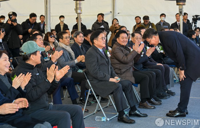[서울=뉴스핌] 양윤모 기자 = 오승록 노원구청장이 1일 오전 서울 노원구 '중계본동 주택재개발 정비사업 기공식'에 참석해 고개숙여 인사하고 있다. 오승록 노원구청장은 “시의원부터 시작해 주민 여러분과 함께 16년간 동고동락해 온 이곳이 드디어 새로운 출발선에 서게 되어 감개무량하다.”며 “사업이 끝까지 안전하고 원활하게 추진될 수 있도록 최선을 다하겠다”고 말했다. 행사에는 오세훈 서울시장,오승록 노원구청장,우원식 국회의장,최호정 서울시의회 의장 등이 참석했다. 서울의 마지막 달동네라 불리는 중계동 30-3번지 일대 ‘백사마을’은 지하 4층∼지상 35층, 26개 동, 총 3178가구(임대 565가구 포함) 규모의 대단지 아파트로 2029년 완공을 목표로 하고 있다. [사진=노원구청] 2025.12.01 yym58@newspim.com