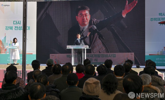 [서울=뉴스핌] 양윤모 기자 = 오승록 노원구청장이 1일 오전 서울 노원구 '중계본동 주택재개발 정비사업 기공식'에 참석해 축사를 하고 있다. 오승록 노원구청장은 “시의원부터 시작해 주민 여러분과 함께 16년간 동고동락해 온 이곳이 드디어 새로운 출발선에 서게 되어 감개무량하다.”며 “사업이 끝까지 안전하고 원활하게 추진될 수 있도록 최선을 다하겠다”고 말했다. 행사에는 오세훈 서울시장,오승록 노원구청장,우원식 국회의장,최호정 서울시의회 의장 등이 참석했다. 서울의 마지막 달동네라 불리는 중계동 30-3번지 일대 ‘백사마을’은 지하 4층∼지상 35층, 26개 동, 총 3178가구(임대 565가구 포함) 규모의 대단지 아파트로 2029년 완공을 목표로 하고 있다. [사진=노원구청] 2025.12.01 yym58@newspim.com
