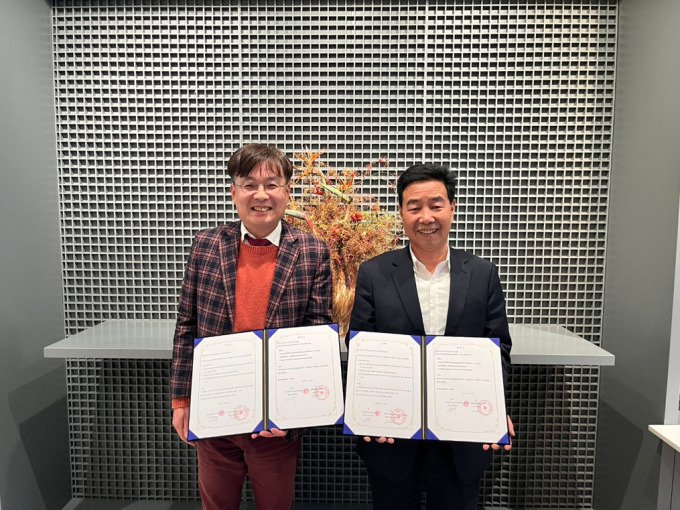 | 박성규 나노실리칸첨단소재 사장(왼쪽)과 중국 파트너사 현지 총경리가 실리콘 슬러지 구매 의향서(LOI)를 체결한 뒤 기념 촬영을 하고 있다. [사진=나노실리칸첨단소재 ] |