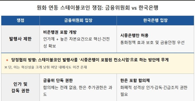 스테이블코인 발행사에 대해 금융위원회는 은행으로 제한을 두지 않고 핀테크 등 비은행권에도 문호를 열되, 인가제와 높은 자기자본 요건을 통해 건전성과 혁신성을 동시에 확보하자는 입장이다.