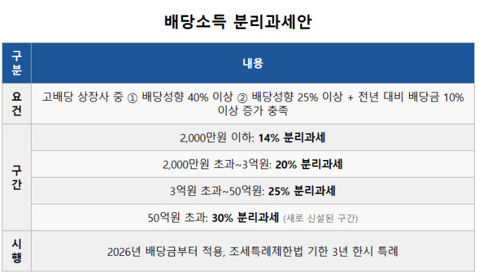 3일 금융투자업계와 정치권에 따르면 정부·여당이 합의한 세부안에서 분리과세 대상은 ▲배당성향 40% 이상이거나 ▲배당성향 25% 이상이면서 전년 대비 배당금이 10% 이상 증가한 경우다.