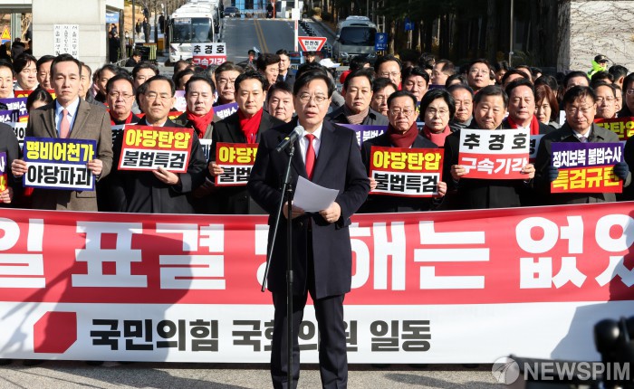 [서울=뉴스핌] 최지환 기자 = 송언석 국민의힘 원내대표가 2일 오후 서울 서초구 서울중앙지방법원 앞에서 추경호 국민의힘 의원의 영장실질심사를 앞두고 열린 추경호 의원 구속 심사 규탄대회에서 발언하고 있다. 2025.12.02 choipix16@newspim.com