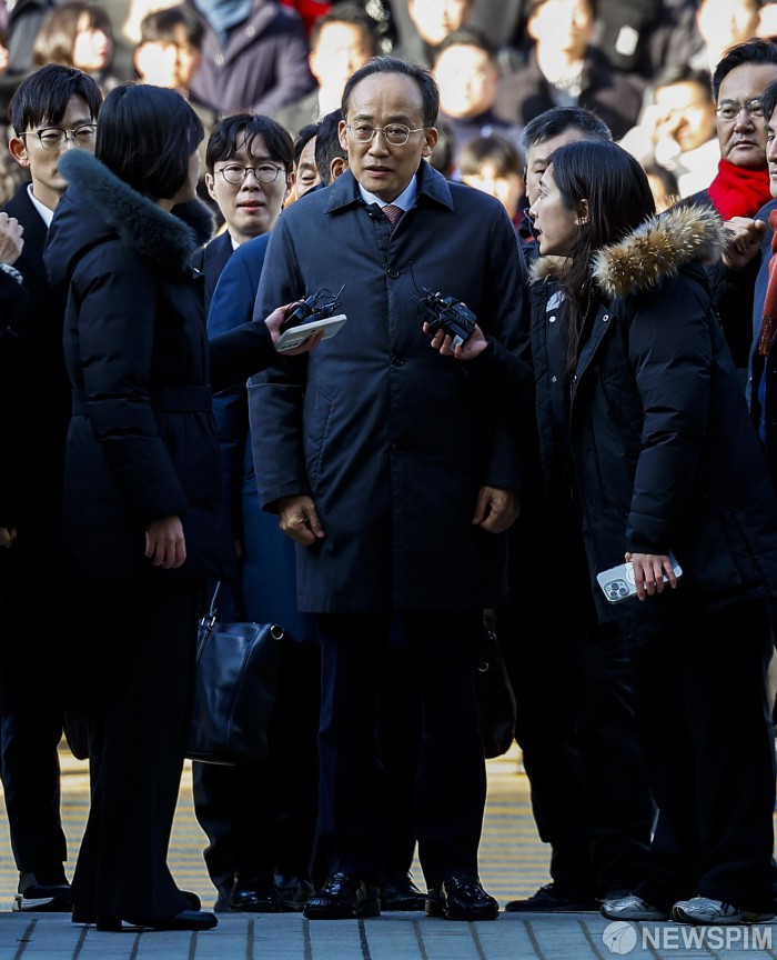 [서울=뉴스핌] 최지환 기자 = 국회의 12·3 비상계엄 해제 의결 방해 의혹을 받는 추경호 전 국민의힘 원내대표가 2일 오후 서울 서초구 서울중앙지방법원에서 열린 영장실질심사에 출석하고 있다. 2025.12.02 choipix16@newspim.com