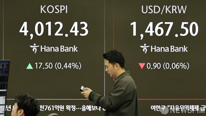 [서울=뉴스핌] 양윤모 기자 = 3일 오전 코스피가 전장 종가보다 17.50 포인트(0.44%) 상승하며 4012.43으로, 코스닥은 2.28 포인트(0.25%) 상승한 930.70으로 장을 시작한 가운데, 서울 중구 하나은행 딜링룸에서 직원들이 업무를 보고 있다. 서울외환시장에서 달러/원 환율은 전장 대비 0.90원 하락한 1467.50원에 주간거래를 시작했다. 2025.12.03 yym58@newspim.com
