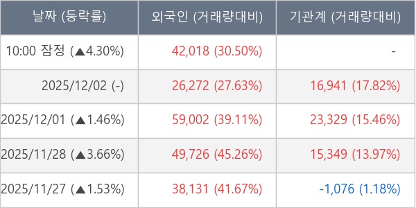 [서울=뉴스핌] 로보뉴스 = 03일 10시 15분 현재 이녹스첨단소재(272290)는 전일 대비 4.30% (현재가 25,450원) 상승했고, 외국인이 최근 7일 연속 순매수(누적 26.50만 주, 잠정) 행진을 하고 있다.