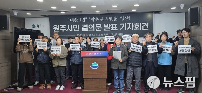 [원주=뉴스핌] 이형섭 기자 = 민주주의를 지향하는 원주시민들이 윤석열 전 대통령의 불법·위헌 비상계엄 선포 1년을 맞아, 내란 세력의 완전한 청산과 민주주의의 실질적 회복을 요구하는 기자회견을 원주시청 브리핑룸에서 가졌다.