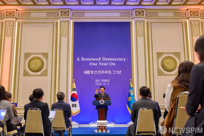 [서울=뉴스핌] 이재명 대통령이 3일 서울 종로구 청와대 영빈관에서 열린 외신 기자회견에서 취재진의 질문에 답하고 있다. [사진=대통령실] 2025.12.03 photo@newspim.com