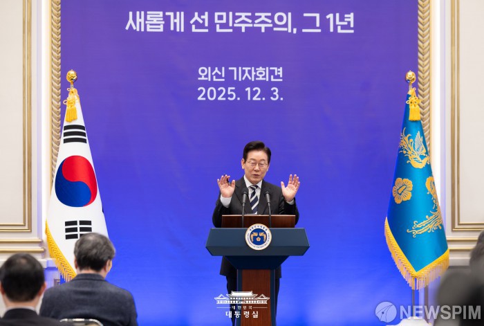 [서울=뉴스핌] 이재명 대통령이 3일 서울 종로구 청와대 영빈관에서 열린 외신 기자회견에서 취재진의 질문에 답하고 있다. [사진=대통령실] 2025.12.03 photo@newspim.com