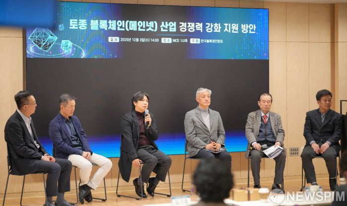 [서울=뉴스핌] 한국블록체인협회(문영배 수석 부회장)가 3일 서울 여의도 NICE 1사옥 컨퍼런스홀에서 ‘토종 블록체인(메인넷) 산업 경쟁력 강화 지원방안’을 주제로 세미나를 열고 급변하는 글로벌 금융 인프라 변화에 대응하기 위한 전략을 논의했다. 행사에 참석한 이상윤대표(왼쪽부) , 권혁일이사장, 이종혁교수, 윤석빈교수, 김기흥교수, 문영배박사, 김기홍교수가 토론을 하고 있다. [사진=한국블록체인협회] 2025.12.04 photo@newspim.com
