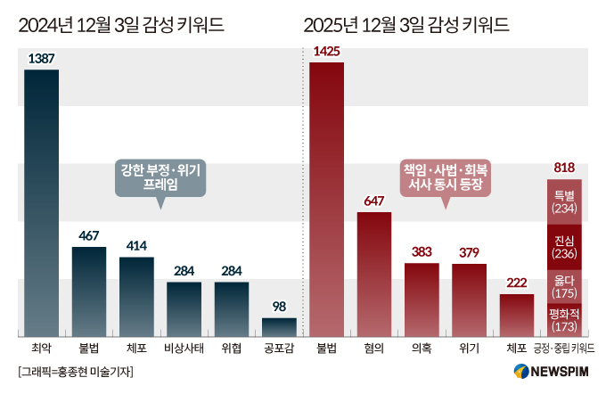 [서울=뉴스핌] 박성준 박찬제 기자 김종원 선임기자 = 12월 3일 '계엄' 키워드를 둘러싼 온라인 여론이 1년 새 크게 달라진 것으로 나타났다. 지난해 같은 날 온라인을 뒤덮었던 '비상·위기·불안' 정서는 올해 들어 '정치·사법적 평가'와 '책임 공방' 중심으로 재편된 모습이다.