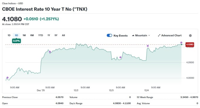 | 미 국채 10년물 금리, 자료=야후 파이낸스, 2025.12.05 koinwon@newspim.com |
