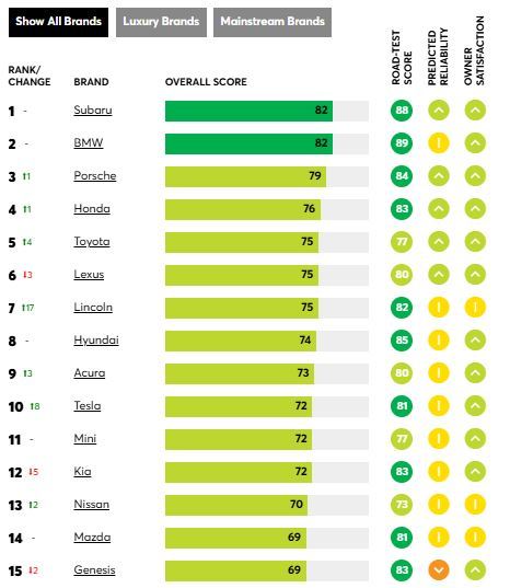 컨슈머리포트가 4일(현지시간) 공개한 31개 브랜드 종합 순위에서 스바루는 82점을 받아 지난해에 이어 1위에 올랐다. BMW가 2위로, 순위 변동이 없었다.