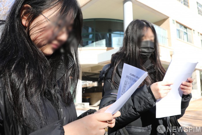[서울=뉴스핌] 이형석 기자 = 2026학년도 대학수학능력시험 성적표 배부일인 5일 오전 서울 여의도 인근 고등학교에서 학생들이 성적표를 확인하고 있다. 2025.12.05 leehs@newspim.com