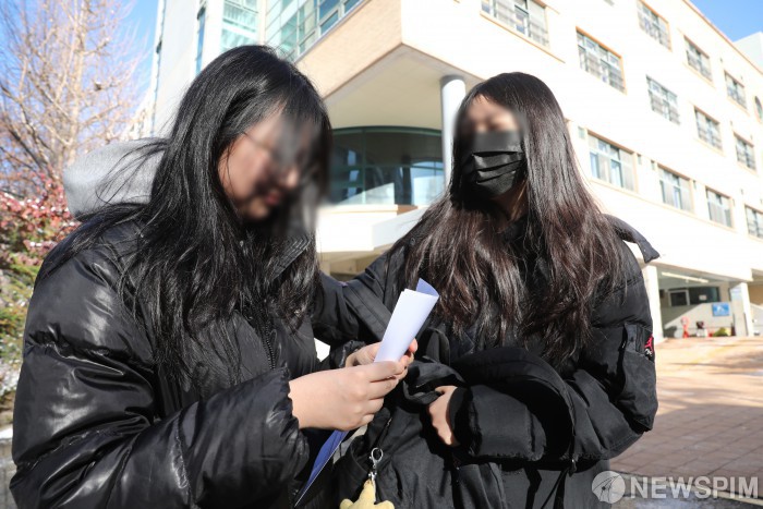 [서울=뉴스핌] 이형석 기자 = 2026학년도 대학수학능력시험 성적표 배부일인 5일 오전 서울 여의도 인근 고등학교에서 학생들이 성적표를 확인하고 있다. 2025.12.05 leehs@newspim.com