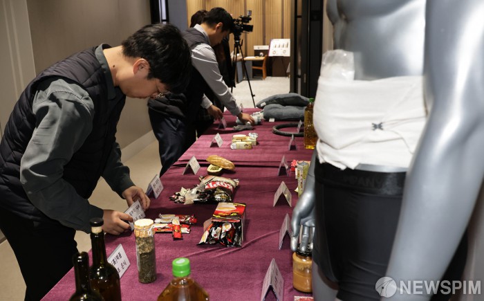 | [서울=뉴스핌] 양윤모 기자 = 5일 오전 서울 강남구 논현동 서울세관에서 관세청 관계자가 과자, 스틱커피, 아보카도유 등에 은닉해 국경 단계에서 적발된 마약 은닉도구 샘플을 공개하고 있다. 관세청은 올해 1∼10월까지 국경단계서 적발된 마약 규모는 2천913㎏으로, 지난해 같은 기간의 4배로 급증하며 역대 최대치를 기록했으며,경로별로 항공 여행자가 1년 전보다 2배 넘은 505건으로 가장 많았다고 발표했다. 2025.12.05 yym58@newspim.com |