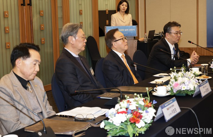 [서울=뉴스핌] 양윤모 기자 = 8일 오후 서울 중구 한국프레스센터에서 개최된 '청년 일자리 첫걸음 실천 선언식'에 참석한 경영계 부회장들이 모두발언을 하고 있다. 행사에는 김영훈 고용노동부 장관, 김창범 한국경제인협회 상근부회장, 이동근 한국경영자총협회 상근부회장, 이상복 대한상공회의소 인력개발사업단장, 오기웅 중소기업중앙회 상근부회장, 이호준 한국중견기업연합회 상근부회장이 참석했다. 2025.12.08 yym58@newspim.com