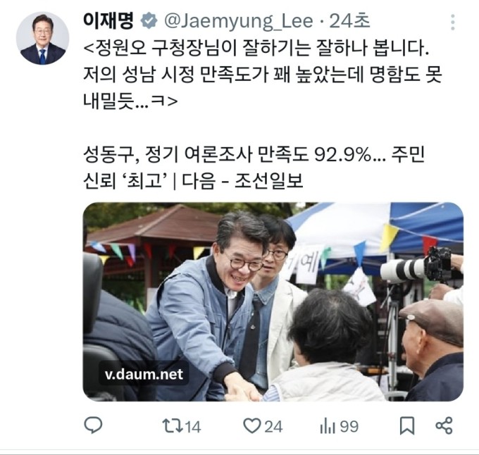 그러면서 이 대통령은 "정원오 구청장이 일을 잘하기는 잘하나 보다. 저의 성남 시정 만족도가 꽤 높았는데 명함도 못 내밀듯"이라고 적었다.