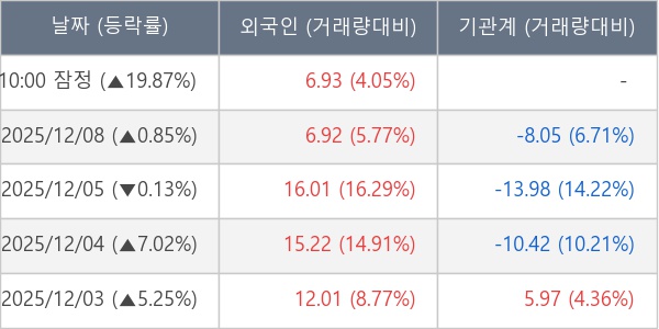 [장중수급포착] 쓰리빌리언, 외국인 8일 연속 순매수행진... 주가 +19.87%