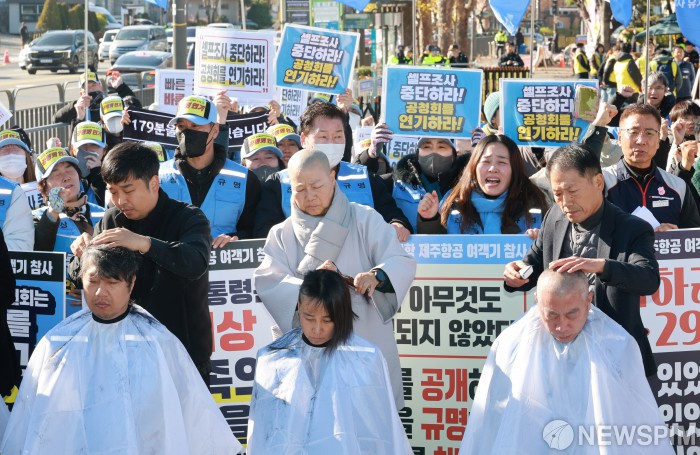 | 12·29 제주항공 여객기 참사 유가족들이 지난 1일 서울 용산구 대통령실 앞에서 항공철도사고조사위원회(항철위)가 국토교통부에서 독립될 때까지 공청회와 중간발표 중단을 촉구하며 삭발을 하고 있다. [사진=뉴스핌DB] |