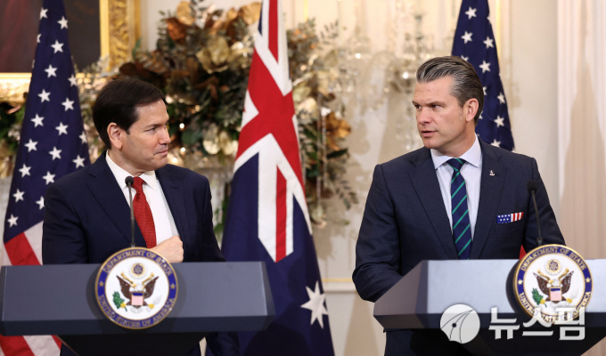 | 마코 루비오 미국 국무장관(사진왼쪽)이 2025년 12월 8일 미국 워싱턴 D.C. 국무부에서 열린 호주-미국 장관급 협의회(AUSMIN) 동안, 피트 헤그세스 미국 국방부 장관을 바라보고 있다. [사진=로이터 뉴스핌] |