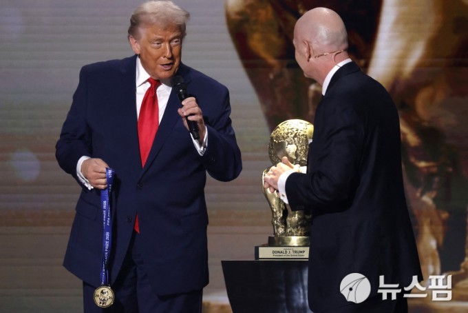 | [워싱턴 로이터=뉴스핌] 박상욱 기자= 잔니 인판티노 FIFA 회장이 지난 6일 북중미 월드컵 조 추첨 행사에서 트럼프 대통령에게 초대 FIFA 평화상을 수여하고 있다. 2025.12.6 psoq1337@newspim.com |