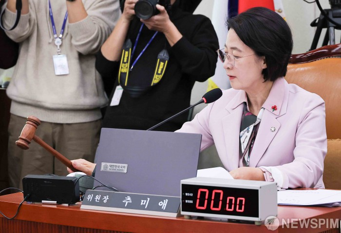 [서울=뉴스핌] 윤창빈 기자 = 추미애 국회 법제사법위원장이 10일 오전 서울 여의도 국회에서 열린 법제사법위원회 전체회의에서 의사봉을 두드리고 있다. 2025.12.10 pangbin@newspim.com
